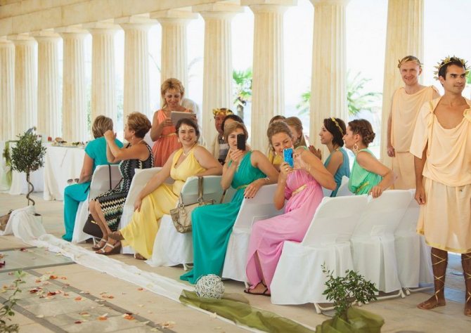 Тематическая свадьба требует особого сценария. Пусть в основу программы лягут древнегреческие мифы. В качестве пассивного развлечения, когда гости увлечены едой и напитками, можно устроить веселую викторину на знание мифологии. Примеры вопросов:
