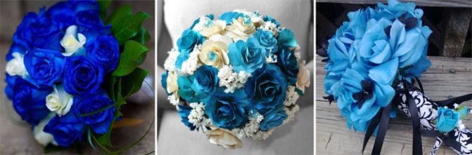 Создавая свадебные букеты, флористы нередко используют розы синих, голубых тонов. Такие цветы считаются символом достижения невозможных результатов. В природе не существует роз с голубыми лепестками, они были выведены искусственно. Эти цветы дарят людям загадочным, неординарным. Синие розы символизируют любовь, восхищение, очарование.