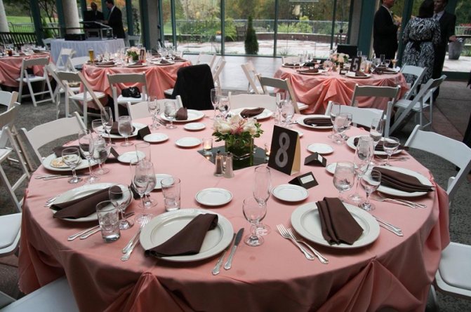 Не используйте слишком много темного цвета, чтобы помещение не выглядело мрачно и неуютно. Так, при темных чехлах на стульях и раннерах на столах выберите основную скатерть светлого оттенка, а в качестве драпировок стен и свадебной арки – легкие полупрозрачные ткани молочного или бежевого цвета.