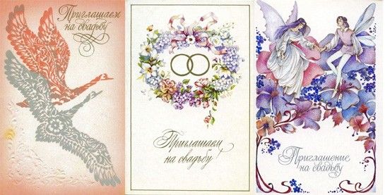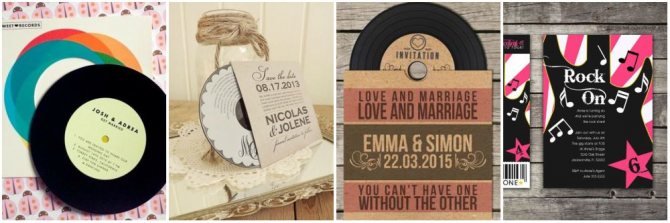 Свадебные пригласительные в стиле 80-х – это сплошной Hand-made, яркий, пестрый, блестящий. Оформляются открытки с помощью цветной печати, глиттеров, бисера или пайеток, а также имитируется «витражное стекло». Поместить приглашения можно в бутафорские конверты от виниловых пластинок. Расписать можно и старые мини винилы. А на обычном картоне или крафт-бумаге можно сделать эффектные принты своих кумиров из 80-х.