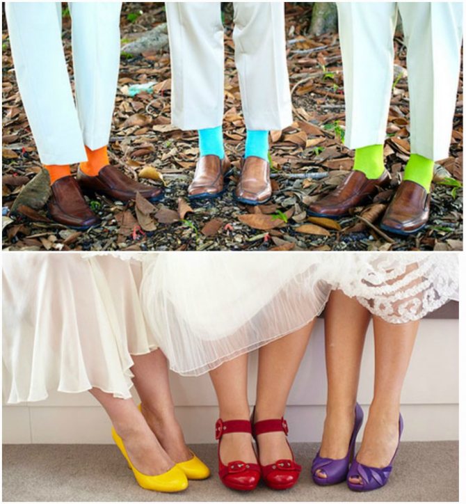 Неформальный стиль создадут также праздничная футболка, потертые джинсы или рубашка. Высокая платформа мужских туфель – то, что надо на свадебной диско вечеринке. Подойдут комбинации в виде обтягивающего гольфа с пиджаком, брюк-клеш, мокасинов со шнуровкой.