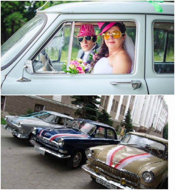 Любимые 80-е подготовили массу «отечественных» вариантов: «Победа», «Чайка», «Волга». Кроме куклы на капоте, украсьте ретро-кар гирляндой, шариками, лентами. Чем богаче цветовая гамма декора, тем ближе к стилю диско вы приблизитесь. В салон авто можно повесить миниатюрный зеркальный шар. Такая машина будет симпатично смотреться в качестве фотозоны молодожен.