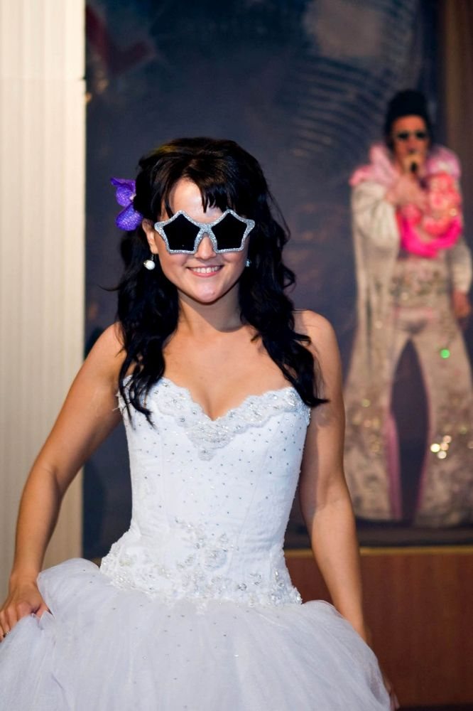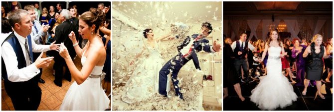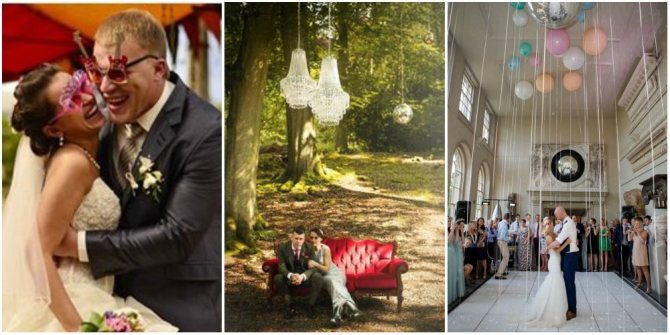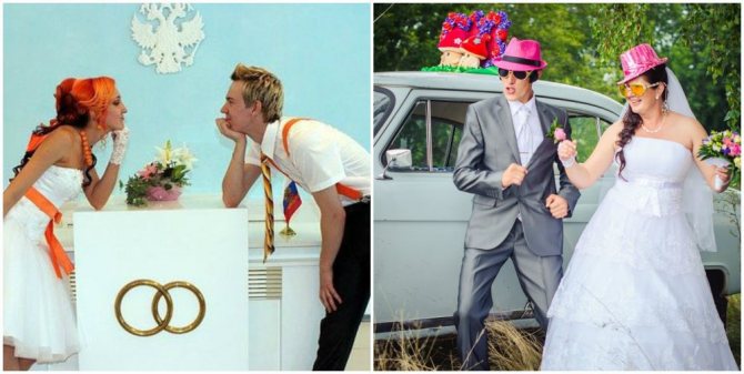 Невеста может предстать перед публикой в пышном платье, блестящем или матовом цветном блейзере с лосинами, в комбинезоне, трикотажном наряде, не стесняющем движений. Вариант для жениха – белый блестящий костюм, брюки-клёш, рубашка-батник, шляпа или парик.