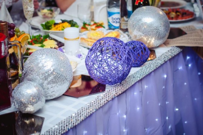 Обязательный атрибут – освещение при помощи вращающегося дискобола. Он всегда будет уместен и подойдет даже в том случае, если тематика свадьбы в малой степени отражена в декоре интерьера. Можно использовать несколько шаров разного размера и цвета. Чем больше красок вы добавите на праздничный танцпол, тем сильнее вы приблизитесь к оригинальному стилю «диско».