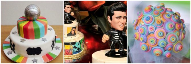 Самым распространенным элементом торта для диско-свадьбы является сладкий диско-шар, который устанавливается вместо верхнего яруса или на него. Боковые стороны коржей украшаются кремом цвета металлик, блестящими звездами, силуэтами танцующих людей, превращая ярусы в подобия танцпола. В дизайне диско-тортов превалирует геометричность, яркие цвета, выраженность элементов, что выделяет их среди классических свадебных угощений. Большой торт может быть использован как свадебный сюрприз, если из него выпрыгнет певец в пышном парике и споет диско-хит.