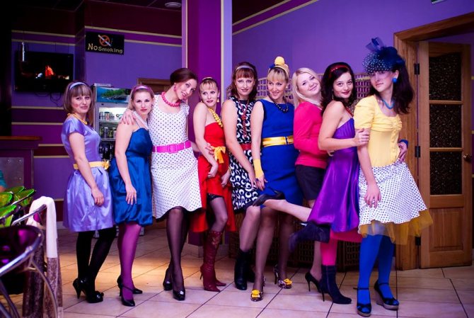 Гости могут поискать в гардеробе следующие элементы стиля: • сапоги-казаки, • джинсы-варенки, • «бананы» брюки, • «косухи» поверх цветастых рубашек или маек, • короткие топы, • лосины, • босоножки на шпильке, кеды • люминесцентные шнурки, • зеркальные очки, пластмассовую оправу для них и пр.