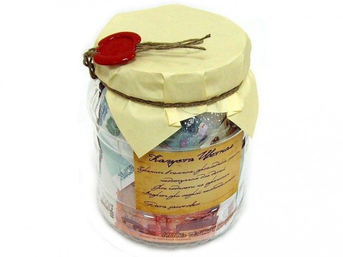4. Четвертое место можно отдать стеклянному «семейному банку». Купить прозрачную копилку несложно в сувенирной лавке или сделать её самому. Изготовление такой копилки своими руками под силу каждому. Обычная стеклянная банка закатывается крышкой, в которой делается прорезь. Опущенные в неё денежные купюры могут стать начальным капиталом для строительства семейного гнезда.