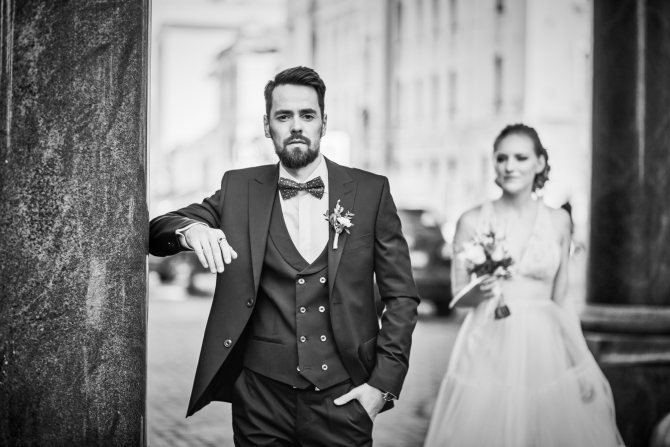 Для взрослых мужчин, отцов молодоженов, лучше выбрать классические костюмы из мягких удобных тканей. Цветовая палитра любая: шоколадный, зелёный, серый, синий… Главное, выбирать спокойные глубокие оттенки и подходящие аксессуары: классический широкий галстук и платочек к нему, кожаный ремень в цвет туфель, запонки и зажим для галстука в одном стиле. Торжество в узком семейном кругу может вполне обойтись и без пиджака: его заменит жилет в цвет брюк или контрастный.