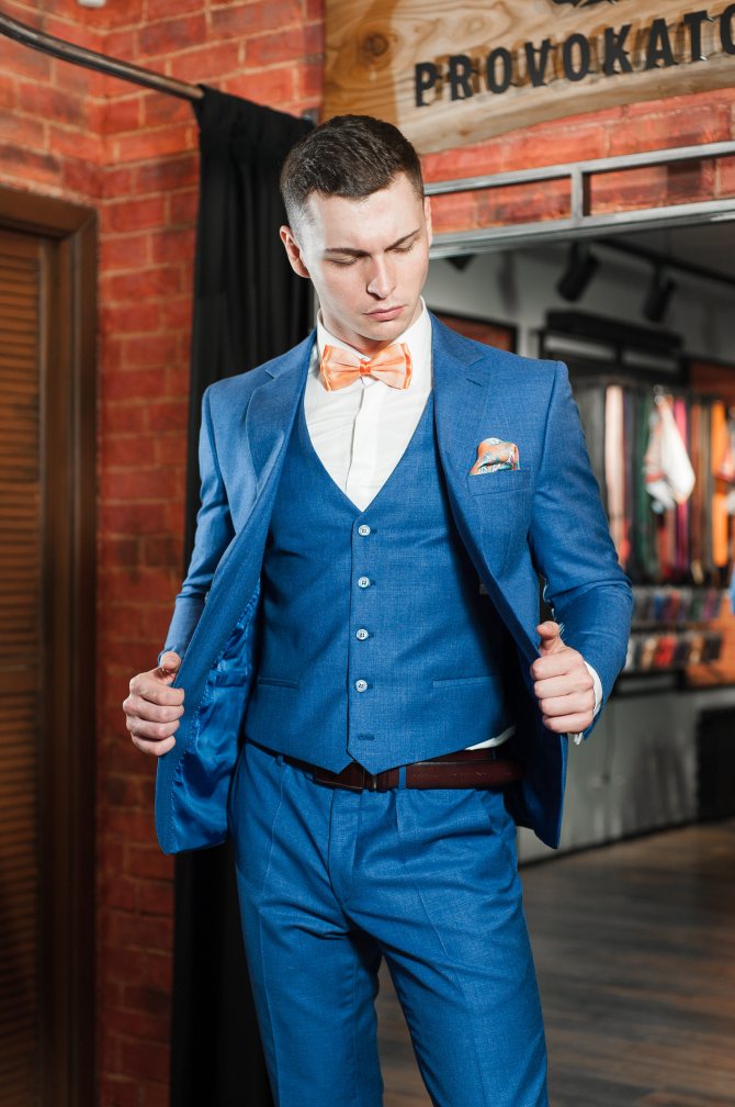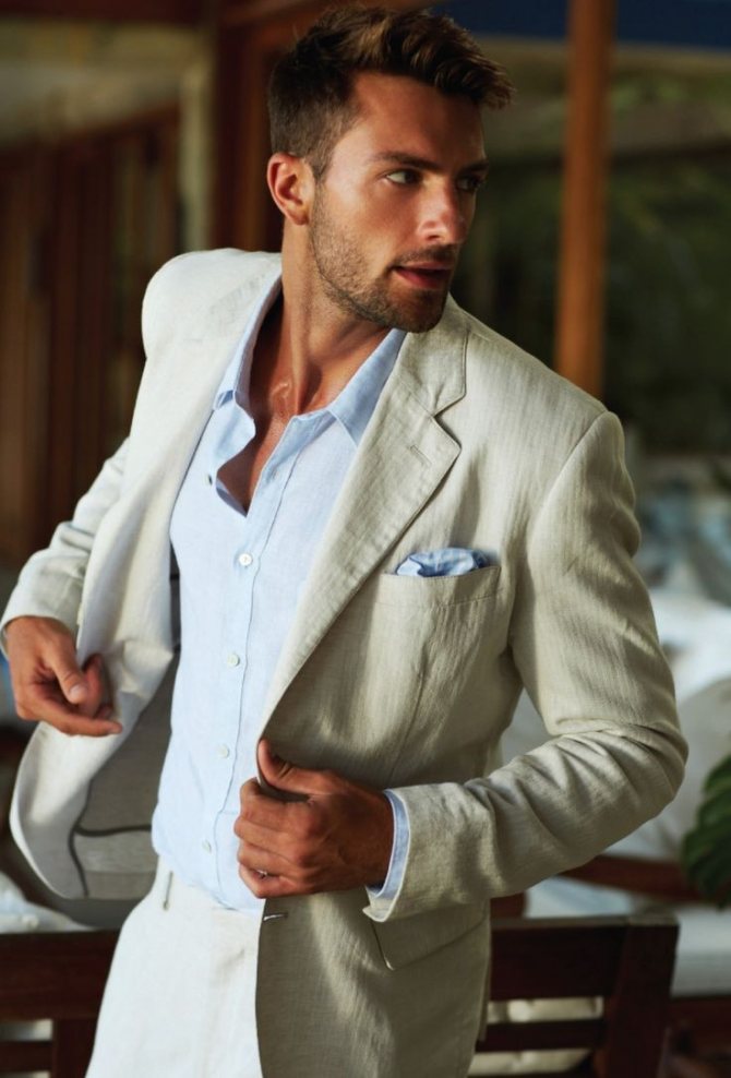 Первое, на что надо обращать внимание при выборе наряда для торжества – сезонность его проведения. Чтобы пойти на свадьбу летом, мужчине лучше отдать предпочтение костюмам из натуральных лёгких тканей: льна или хлопка с небольшим добавлением синтетики (они не так сильно мнутся). Цветовая гамма – светлые пастельные тона: бежевый, серый, желтый, голубой. Для жарких дней или выездных регистраций на пляже или на природе можно пренебречь пиджаком, оставив только брюки и рубашку. Вместо него можно надеть стильный жилет с ярким шейным платком или галстуком-бабочкой.