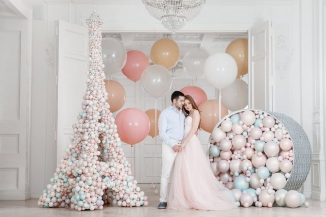 Хотели свадебную фотосессию в Париже на фоне Эйфелевой башни? Для этого совсем не обязательно тратиться на билеты и переноситься в этот город самим. Попробуйте всю эту атмосферу создать на своей свадьбе в родном городе, сделав фотозону из маленьких воздушных шариков. Для начала вам нужно будет сделать каркас башни, как показано на фото, а затем его обвязать шариками. Отметим, что шары должны иметь нежный цвет.