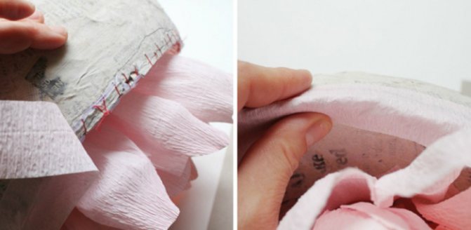 - Для начала подготовьте необходимое вам количество гофрированной бумаги или креп-бумаги нежных оттенков. Из этого материала нужно будет изготавливать цветы. Также для работы вам понадобится клей-пистолет, нитки с иголкой, воздушные шарики, а также старая газета, потому что необходимо будет использовать технику папье-маше.