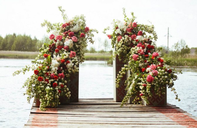 В этом необычном варианте использованы живые цветы, но, как мы видим, они поставлены в вазоны с водой. Эти вазоны очень гармонично смотрятся и составляют целую композицию, потому что расставлены с учетом их высоты и формы. Это роскошный вариант для фотозоны, фотографии получатся отличными, если вы играете свадьбу летом или на каком-то сказочно красивом острове.