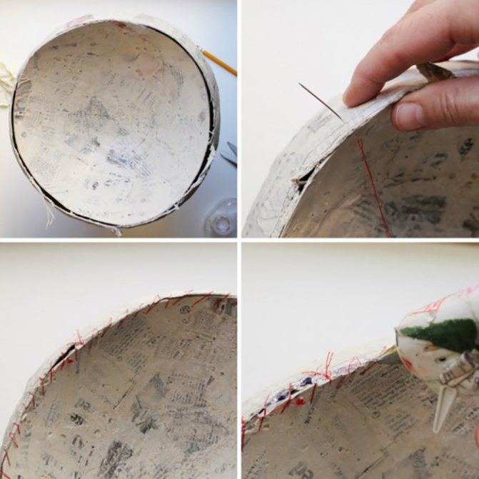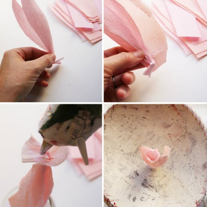 - Теперь каждый лепесточек нужно в его широкой части растянуть, в основания скрутить, чтобы было удобно их приклеивать к заготовке папье-маше. Приклеиваем с помощью термопистолета: