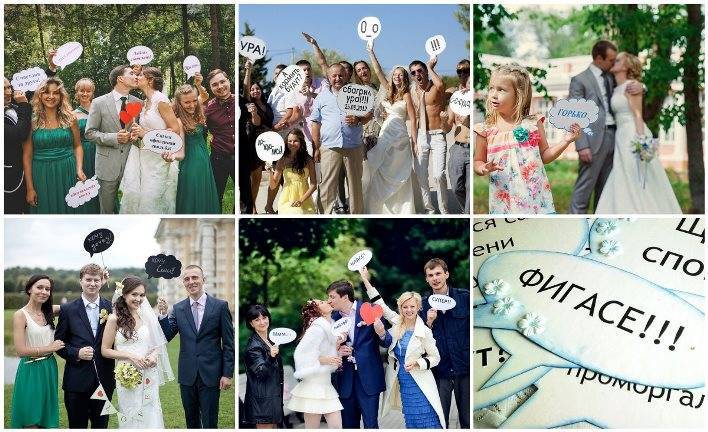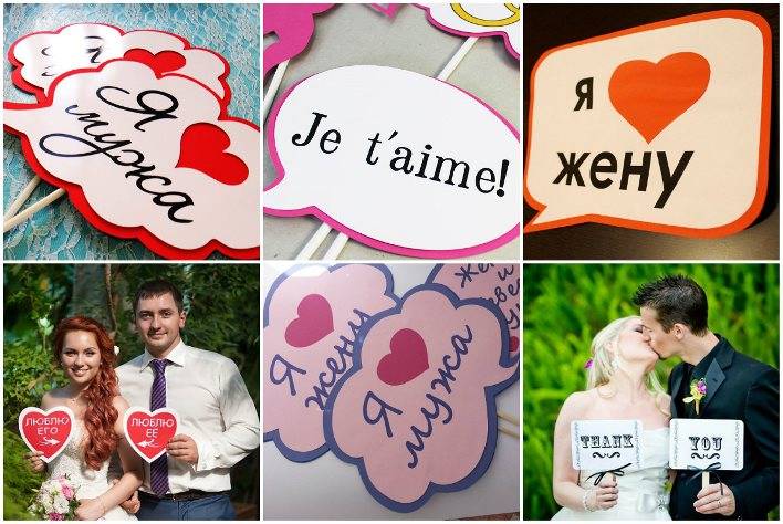 Следующая идея для свадебной фотосессии – речевые облачка. Такой аксессуар заказывается и приобретается в специальных магазинах. Речевые облака помогут оживить фотографии, а также сделать гостей более раскрепощенными во время съемки. Вы можете смастерить такую атрибутику для свадебной фотосессии своими руками. Форму выбирайте любую: в виде сердечка, облака. Текст подсмотрите ниже на фотографиях либо придумайте сами.