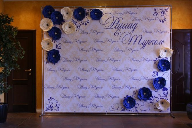 Здесь за основу взят самый простой фон, на нем написаны в шахматном порядке имена супругов. В двух углах полотна прикреплены искусственные цветы. Такой баннер можно растянуть на металлическом или деревянном каркасе и установить в любом месте ресторана, в котором вы играете свадьбу.