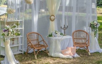 - Летняя зона предполагает самый широкий выбор вариантов и допускает практически все перечисленные идеи. Именно в летний период проводится большинство торжественных выездных церемоний, поэтому часто задействованы природные локации.
