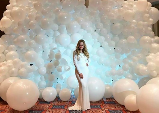 Из простых белых шаров разного размера можно сделать шикарную стенку огромной высоты. Если сделать подсветку сзади этой стенки, то ваша праздничная декорация вызовет восторг у гостей, а фотографии получатся очень оригинальными.