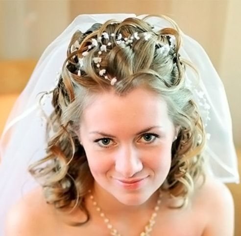 На средних волосах хорошо смотрятся свадебные прически с диадемой, искусственными или живыми цветами, жемчугом, стразами, венком или вуалью. Чем пышнее и обильнее украшениями платье, тем проще должна быть укладка волос и незамысловатее аксессуары.