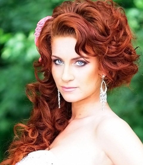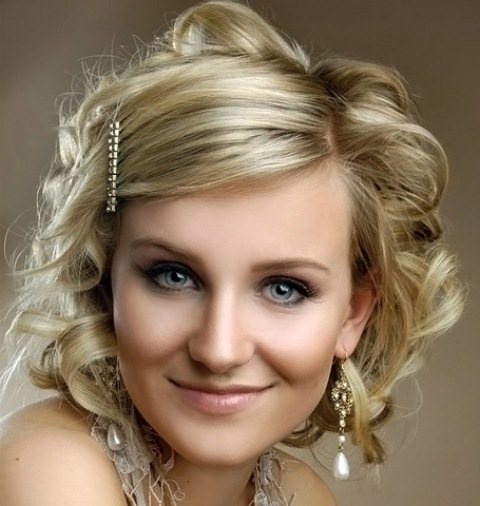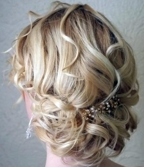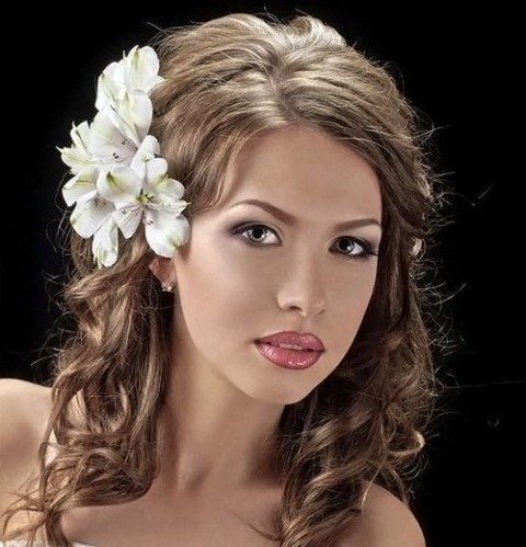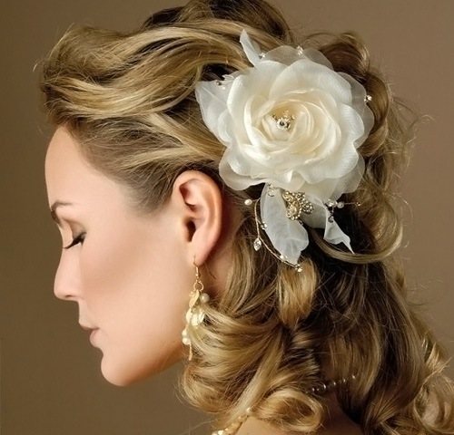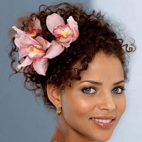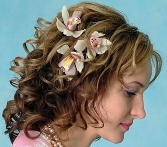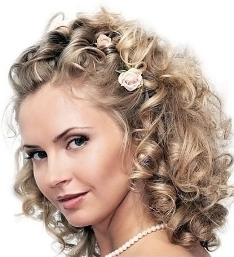 Если длина волнистых локонов больше 8 см, то закрепите волосы по бокам, определив все пряди на затылке. Такой вид укладки подойдет обладательницам тонких кудрявых волос. Красьте прическу бутонами роз или заколкой с жемчугом.