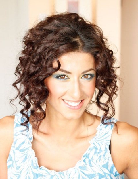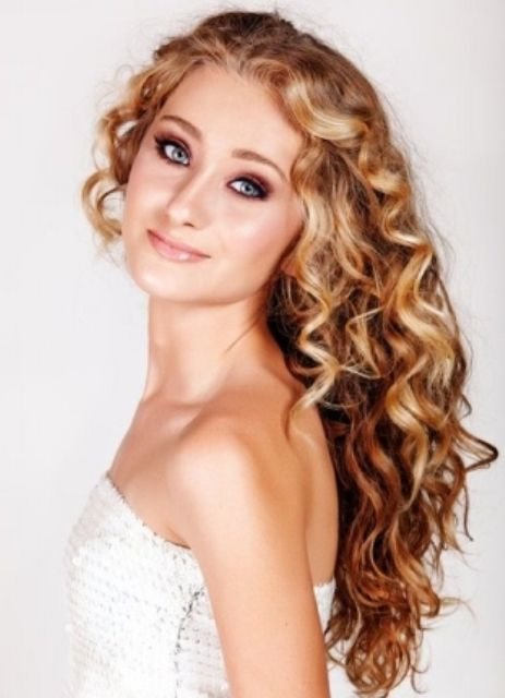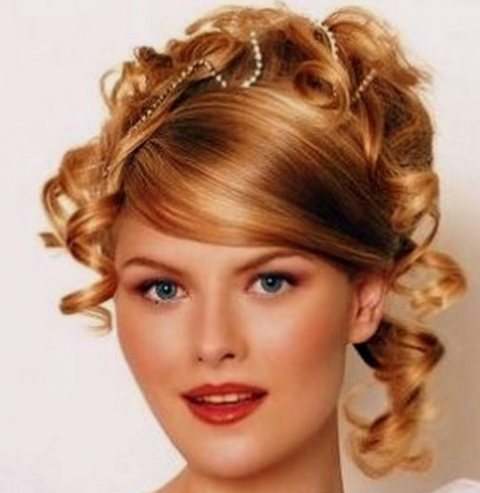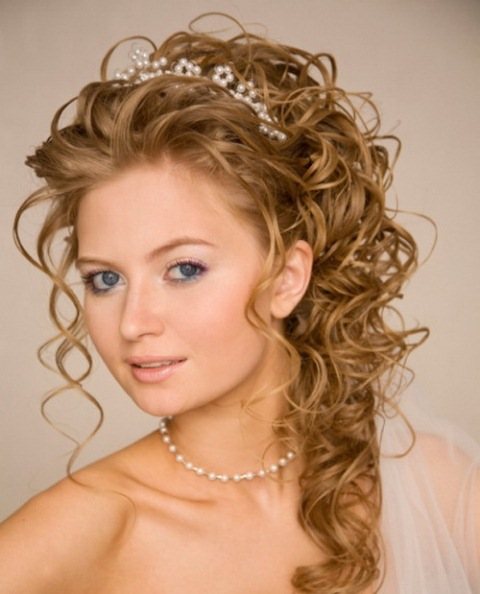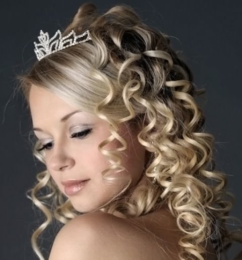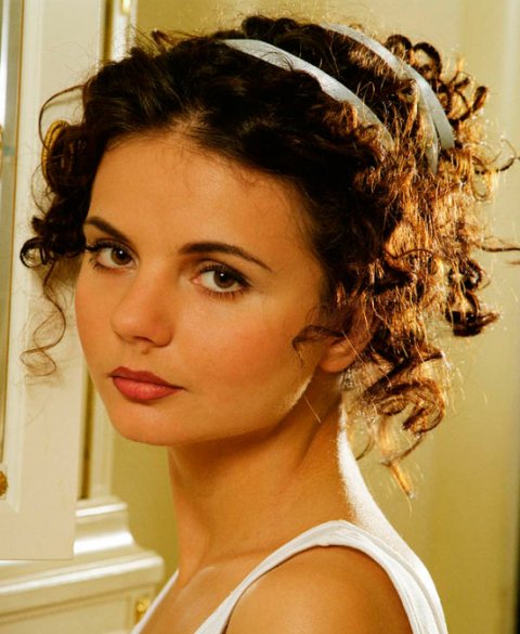 Кудрявые волосы достаточно аккуратно уложить и они будут выглядеть великолепно. Существует много идей, как уложить длинные кудрявые волосы. Романтичный образ создается очень просто – нужно вымыть голову, нанести пенку или мусс и закрутить локоны на плойку, что бы они выглядели ровными и блестящими. Затем, волосы височной зоны закрепить на затылке и украсить прическу обручем с камушками, фатой или диадемой.