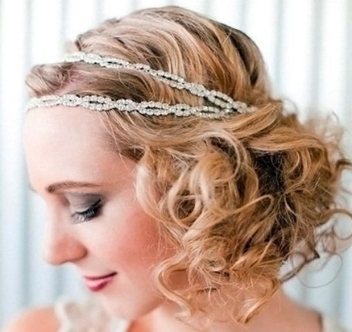 Свадебные прически с челкой на кудрявые короткие волосы хорошо смотрятся с обручем или ободком. Пригладьте непослушные кудряшки ободком и уложите челку на бок, или сформируйте челку так, чтобы ее концы уходили в сторону нежным изгибом.