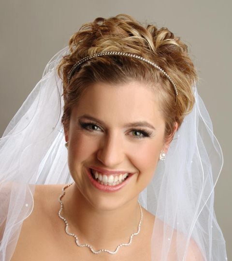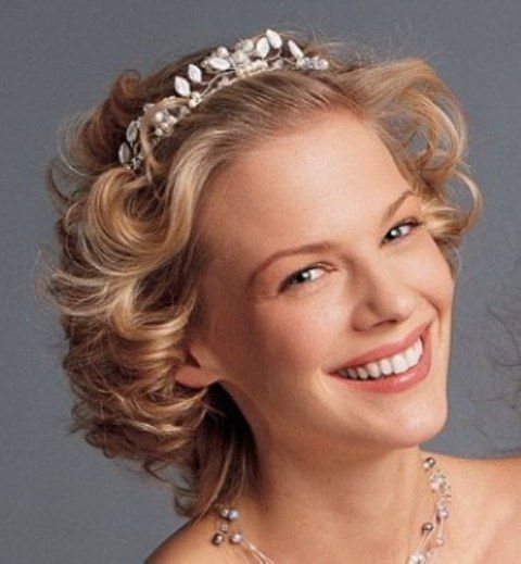 Свадебная прическа для коротких кудрявых волос с диадемой.