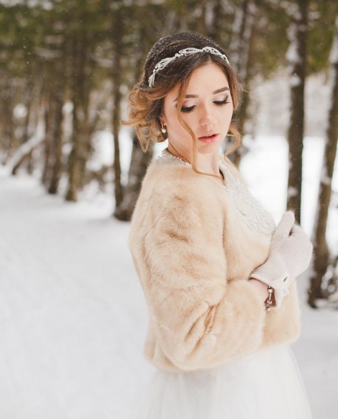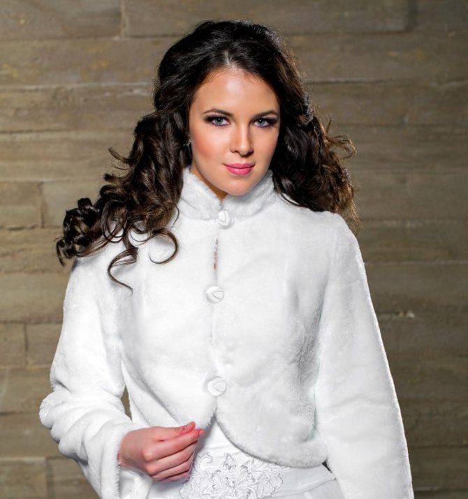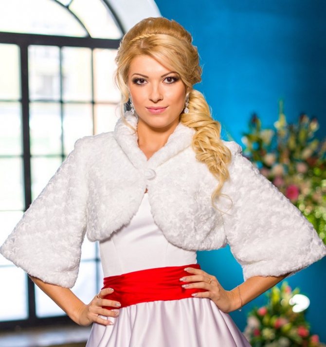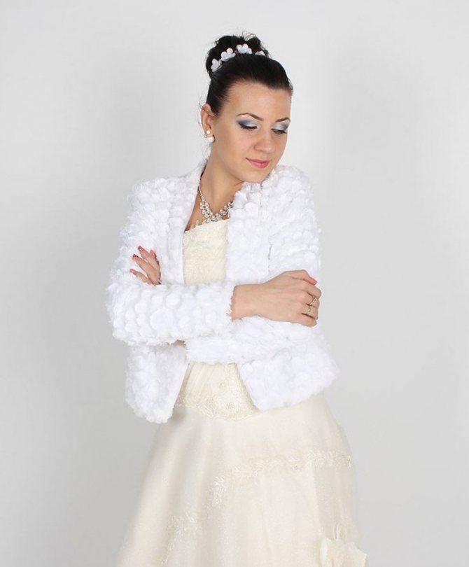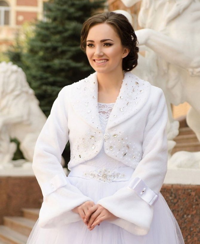 Лучше всего смотрится маленькое белое болеро из короткошерстного меха с рукавом ¾. Оно выгодно подчеркнет платье, фату или шляпку со шлейфом, изящные туфли и длинные перчатки, как на фото свадебной шубки.