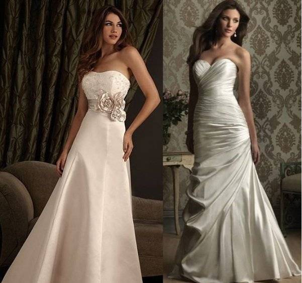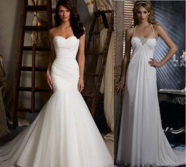 Маленькая грудь с присобранным лифом смотрится выигрышно и объемно. Если ваша фигура – перевернутый треугольник, верх свадебного платья нужно утяжелить бантом, брошью, стразами или бисером.