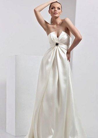 При ярко выраженном поясе область груди лучше не украшать, а выбрать свадебное платье со струящейся тканью – шелком, шифоном, атласом.