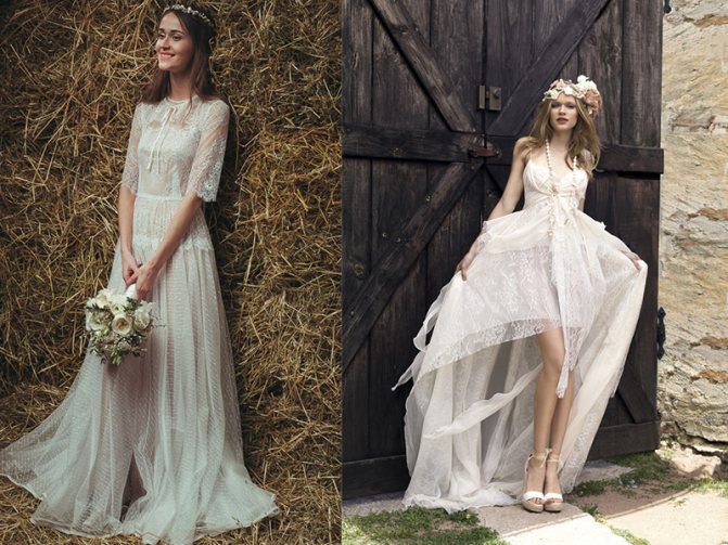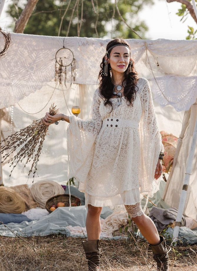 - В стиле хиппи. Прелестные платья для свадебного торжества выполняются короткими, не прикрывающими коленей. Нестандартность, оригинальность, колоритность облику придает множество воланов, шнуровок, бахромы, рюшей. Особенностями изделия являются высокая талия, лаконичность кроя, изящная простота. Ткани для пошива применяются натуральные: лен, хлопок. Прекрасным дополнением свадебного платья в стиле бохо является отделка из кружева. Оттенки изделий светлые, пастельные, используются этнические, цветочные принты, горошек. Чтобы подчеркнуть образ, можно надеть браслеты, фенечки, колечки.