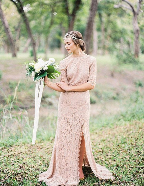 - Винтажные. Популярный стиль отличается использованием ретро-ноток, но выглядят наряды отнюдь не старомодно, а наоборот, современно, стильно, великолепно. Винтажное платье бохо превращает новобрачную в богиню, поскольку придает ей необычайную женственность. Крой прямоугольный, с низкой талией. Изделия выполняются из шелка, шифона, кружева. Используются нежные цвета, но возможно применение насыщенных ярких расцветок.