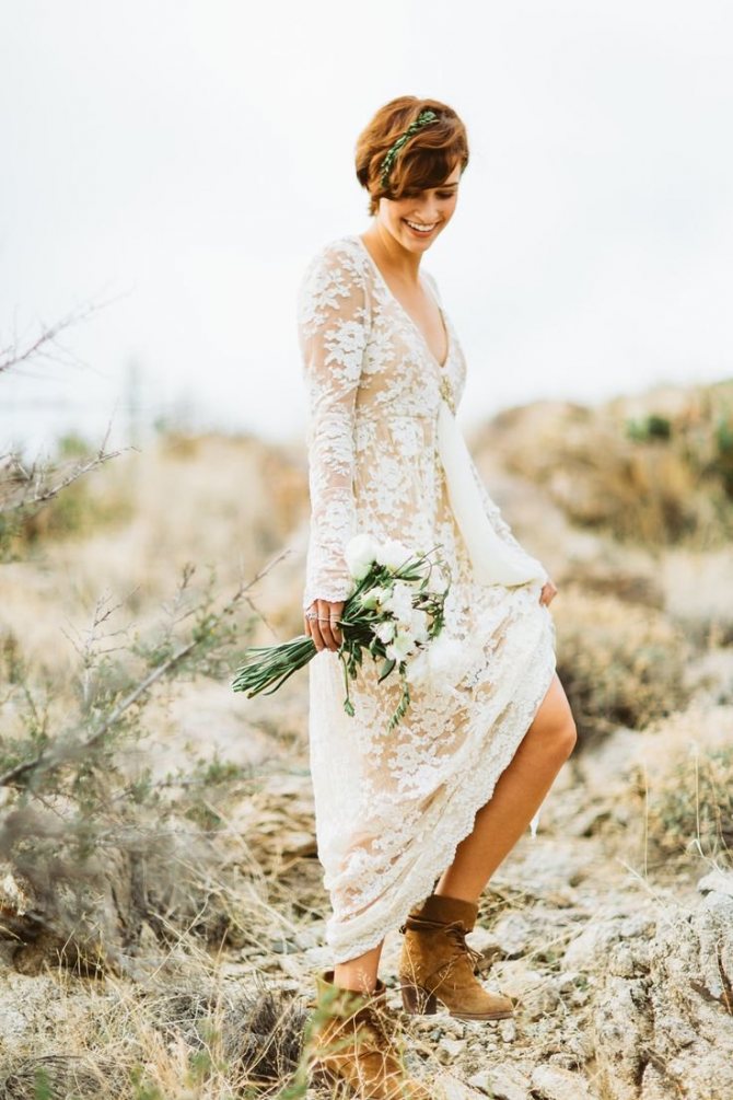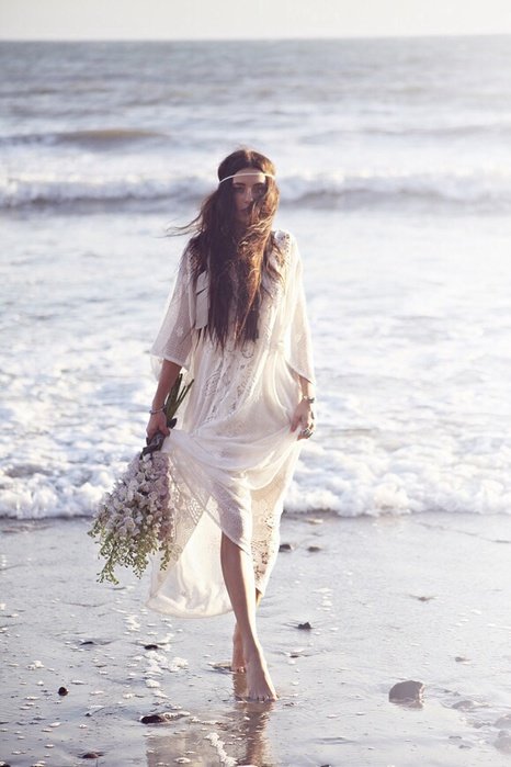 Если торжественная церемония будет проходить на берегу водоема, обувь вовсе не потребуется. Девушка в платье бохо, босиком на побережье будет выглядеть свободно и колоритно.