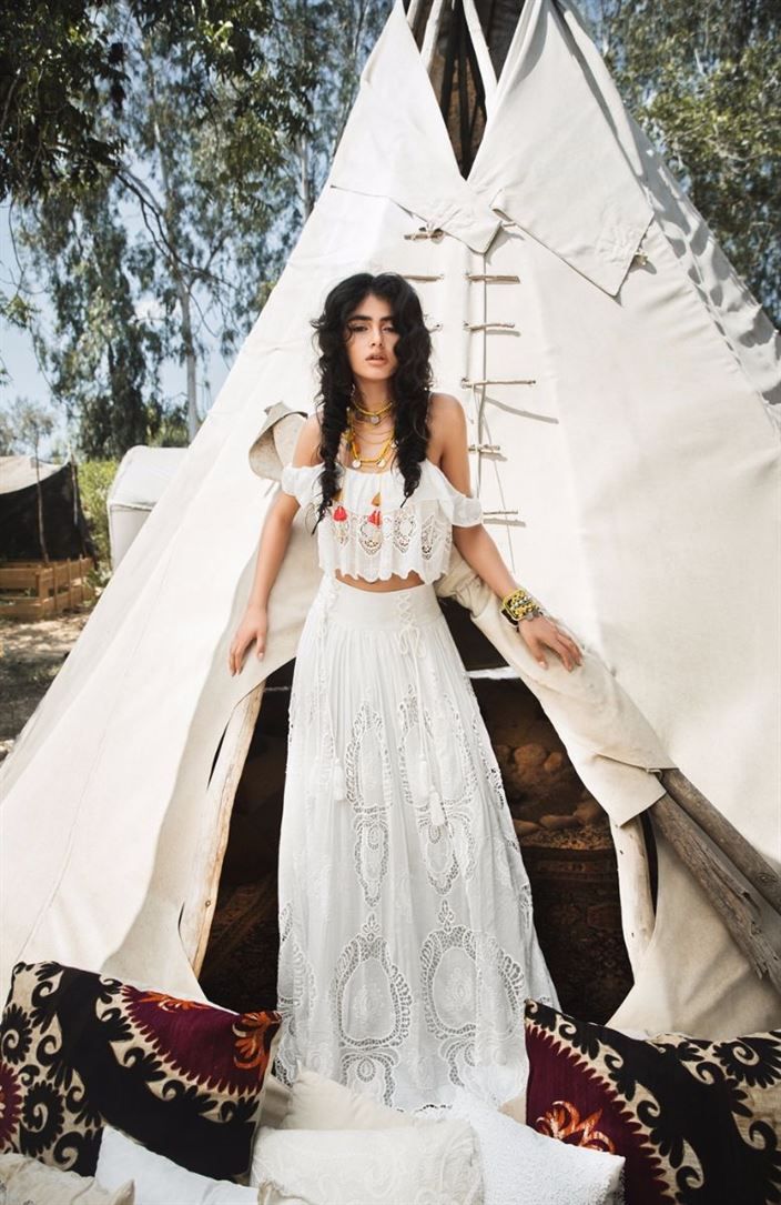 - Цыганский бохо. Он на пике популярности, характеризуется многослойными юбками макси, оборками по низу, кружевными деталями, открытыми плечами, вырезом «кармен», вышивкой. Колоритные модели отличаются нарочитой небрежностью, которую дополняют шаль с большими кистями, массивный пояс из кожи, живые цветы в волосах, крупные золотые украшения. Ткани – легкие, воздушные, ярких расцветок.