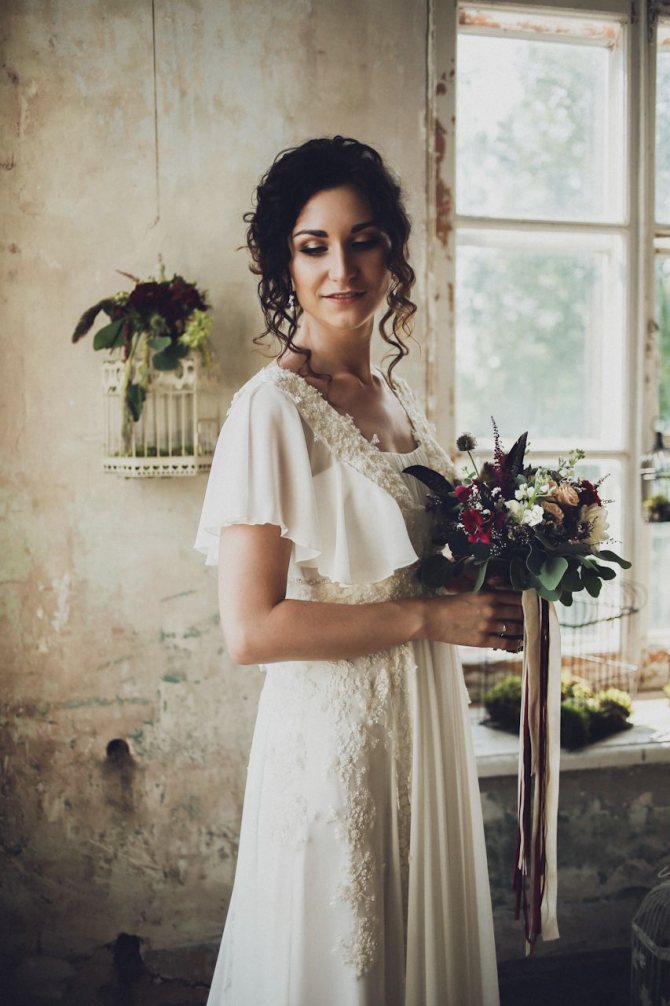 Неотъемлемым атрибутом новобрачной является букет, который должен быть довольно простым – вычурность здесь ни к чему. Предпочтительнее использовать цветы нежных оттенков, собранные в саду или лесу. Ножка букетика небрежно обхватывается красивой кружевной лентой.