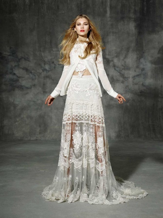 - YolanCris. Модели отличаются оригинальностью, изысканностью, интересным покроем, отделкой, которая выполняется вручную. В коллекциях ощущаются отголоски различных эпох, а также переплетаются особенности многочисленных течений и субкультур. В современных моделях есть рукава, асимметричные юбки со множеством слоев, сложный крой верхней части изделия, открытый верх со шлейфом, фольклорными мотивами. К тому же, некоторые платья отличаются наличием карманов – это тренд сезона. Характерно для свадебных нарядов крупное кружево, которое сплетено крючком. Изделия известного бренда могут быть экстравагантными, небрежными, элегантными, но они всегда уникальны, великолепны, очаровательны.