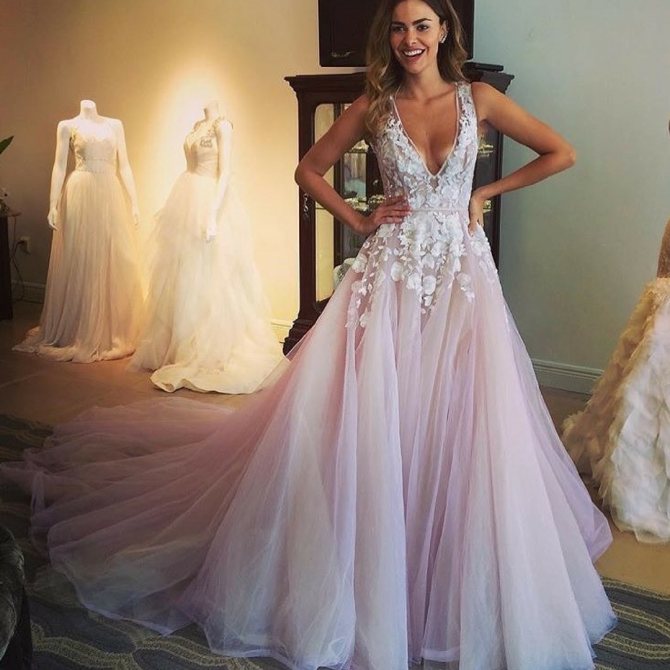 Важно! Невысоким и пухлым красавицам стоит отказаться от обильных оборок, рюшей и крупных аппликаций. Чтобы не выглядеть «грелкой на чайнике» стоит подобрать струящийся материал, свободно ниспадающий до пола. Украсить платье можно стразами, жемчугом, гипюровыми вставками в лифе.