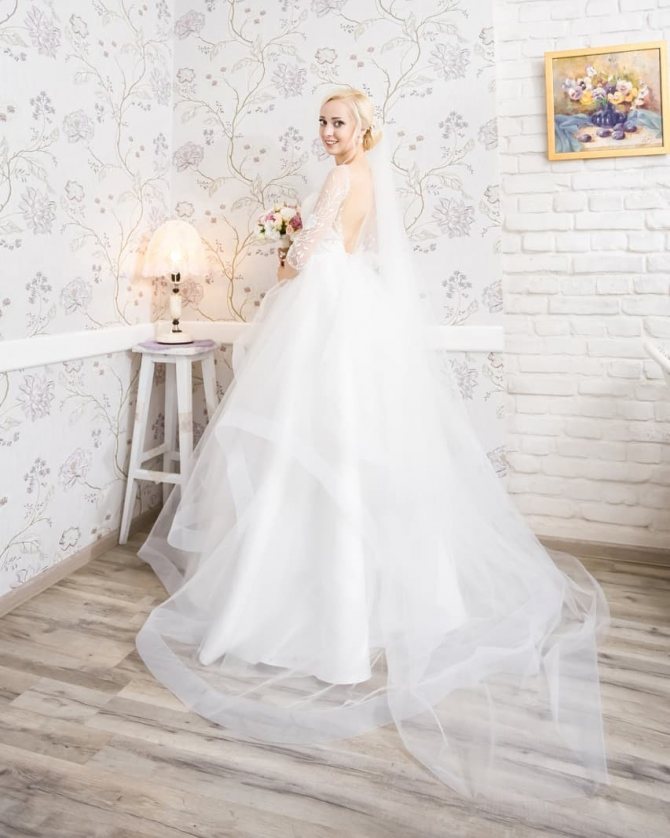- Лучше всего с пышным платьем смотрится однослойная длинная фата;