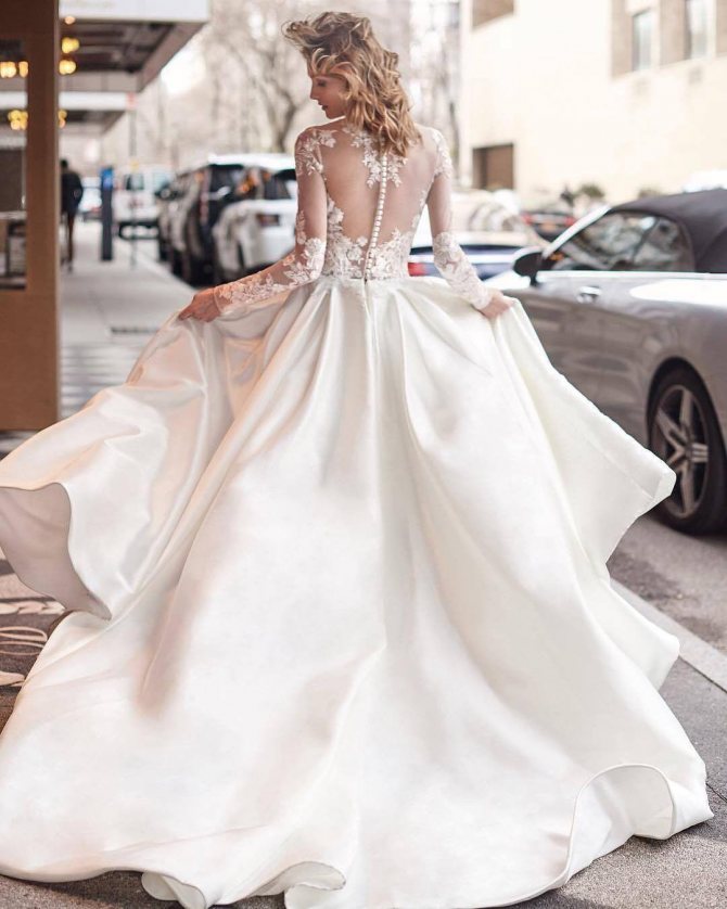 - Гипюровый лиф сочетается с рукавами из плотной ткани, типа парчи, атласа или шелка.
