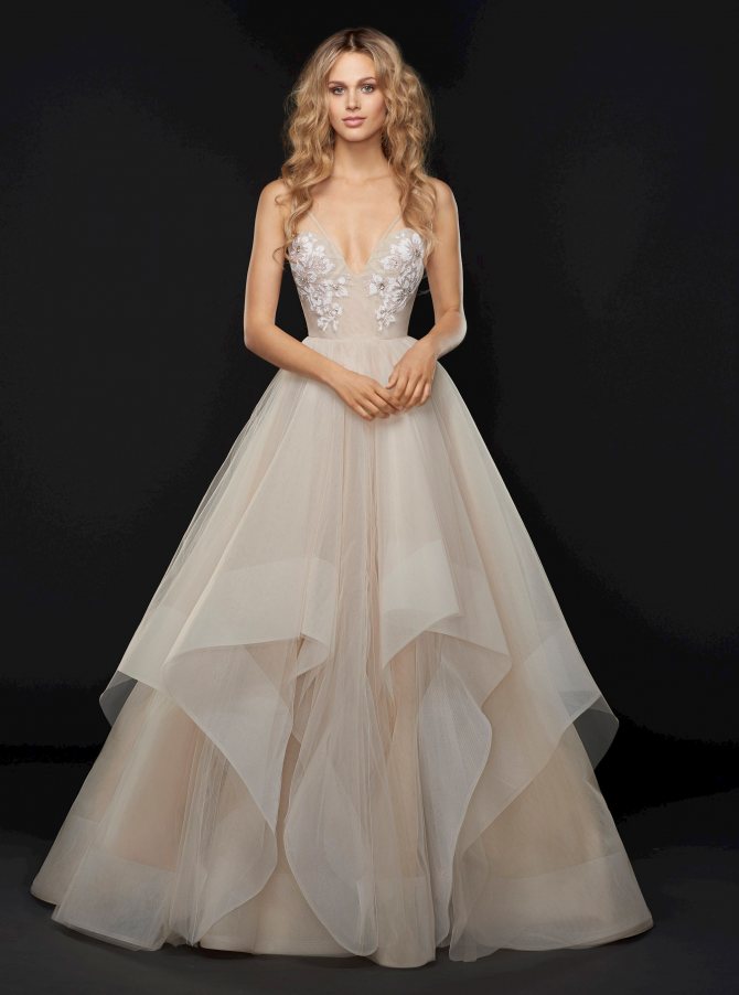 - Крой максимально простой, лаконичный, не вычурный. Полотно красиво ниспадает элегантными складками от талии. Многоярусные подъюбники слегка длиннее покрывающего их основного слоя.