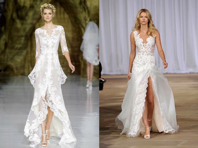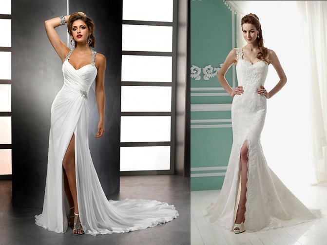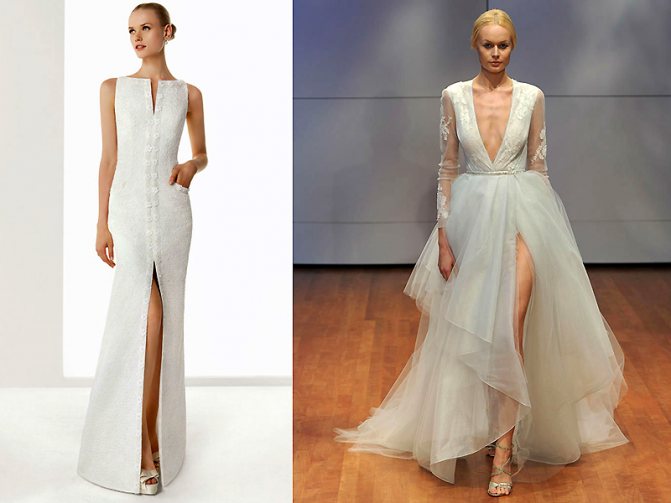 Существует несколько видов разрезов: классический сбоку, привычный посредине и боковые асимметричные разрезы. Асимметричные варианты являются более оригинальными, поскольку они прекрасно выглядят и подчеркивают изящность ног. Прочие модели также обладают своей «изюминой», выделяя силуэт невесты. Кроме того, различные платья имеют характерный стиль: классический, греческий, готический.