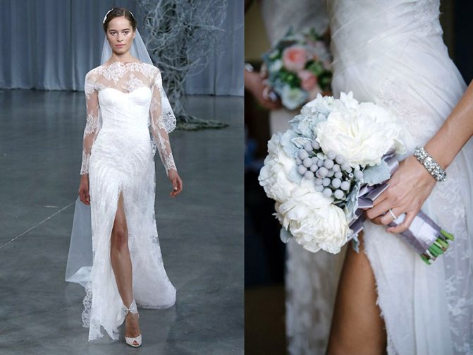 Интересно, но именно разрез является тем элементом наряда новобрачной, который добавляет ей страсти и романтичности. Этих целей добиваются и одеяния с открытым декольте и спиной. Но грамотно выбранный разрез на ноге более выразительно выделяет особенности фигуры.