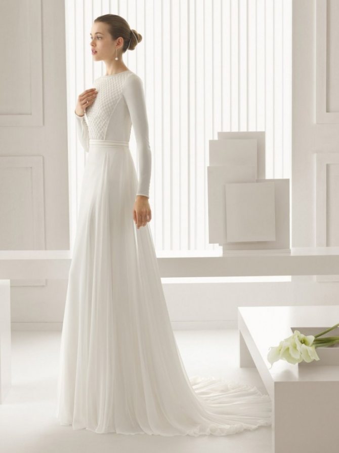 В таком подвенечном одеянии новобрачная появится перед гостями без украшений, дополнительных элементов и кружев. С первого взгляда силуэт может показаться достаточно простым, поэтому хорошо выделить девушку ярким элементом. Подойдет необычное декольте или яркий бант на талии.