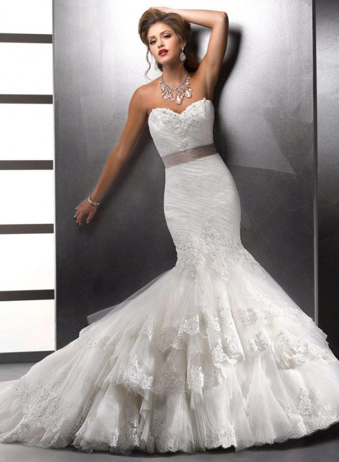 Красиво будет смотреться такое платье на невесте с тонкой талией и широкими бедрами. Одним из минусов является дискомфорт в движении.