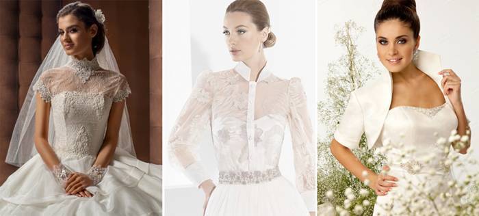 Ретро-модели свадебных нарядов с воротничками и длинным рукавом с манжетами больше подходят совсем юным созданиям с хрупкой фигурой. Длина приталенной модели с более свободной юбкой должна быть выше колена или же опускаться до пола. Манжеты и воротничок, выложенные мелкими кристаллами, придадут одежде праздничный вид. С таким декором дополнительные украшения для свадебного наряда будут лишними.