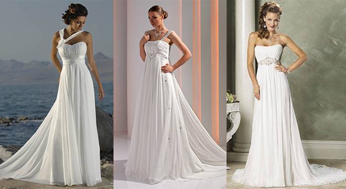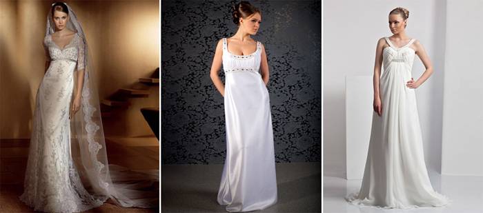 Платья для свадьбы в стиле ампир (имперский) характеризуются завышенной талией, широким поясом под пышной грудью, который украшают стразами или кружевами. Мода на одежду Франции начала 19 века прижилась в современных европейских странах, благодаря ее удобству. Фасон в стиле ампир не сковывает движений невесты, и позволят ей выглядеть молодо и свежо. Свободный покрой скрывает небольшие недостатки фигуры и делает акцент на достоинствах. Пояс иногда заменяют отделкой атласной лентой, завязанной сзади романтическим бантом.