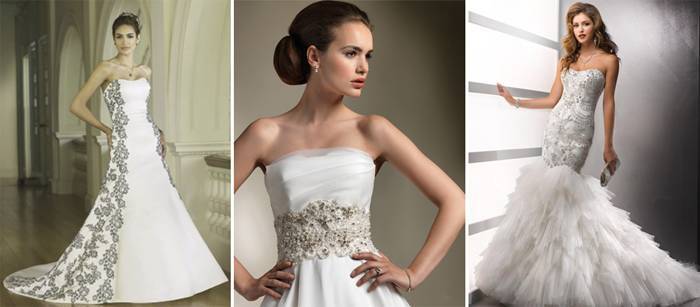 Элементы могут быть разбросаны по всему наряду в хаотичном порядке, едва поблёскивать в складках или создавать неповторимый узор на подоле юбки. Изюминкой украшений может стать использование цветных камней в оформлении платья.