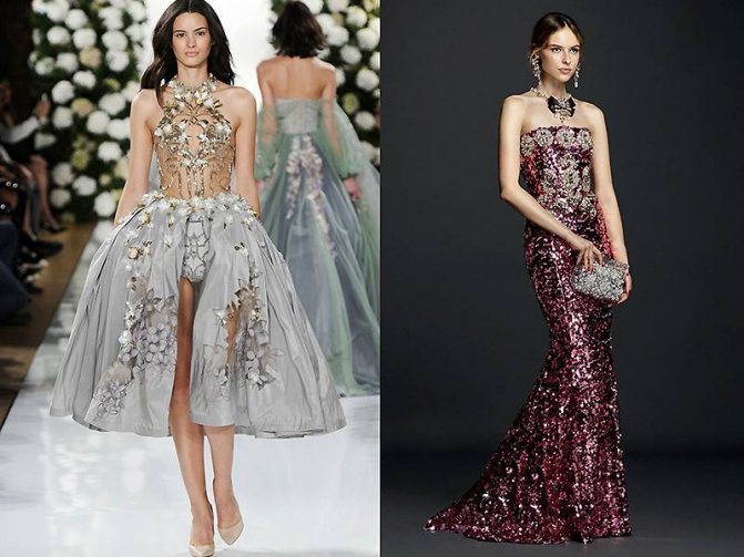 Экстравагантные и в то же время нежные наряды представлены на фото ниже. Оригинальное платье с цветными камнями от Валентина Юдашкина покорит любую публику. Не менее привлекательно смотрятся модели от Elie Saab, Sherri Hill, вдохновляющие своей нежностью.