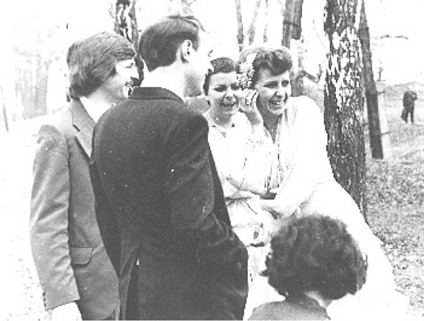 Поляна новобрачных. Когда шампанское было выпито, из кустов неожиданно показалась неопрятная женщина и попросила пустую бутылку. Чем очень всех рассмешила! Фото из семейного архива Елены Рябиковой.