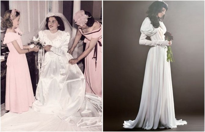 Тогда: свадебная мода всегда шла рука об руку с модой повседневной, отражая и по-своему дополняя основные фэшн-тенденции времени. Например, в 40-е в моду вошел строгий силуэт с акцентом на плечах, подозрительно напоминающий военную униформу.