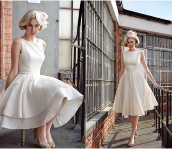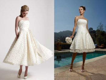 - Короткие свадебные платья с пышной юбкой. А широкий пояс, подчёркивает тонкую талию. Такой наряд позволяет придать невесте идеальные пропорции, вместе с тем показывая красоту ног.